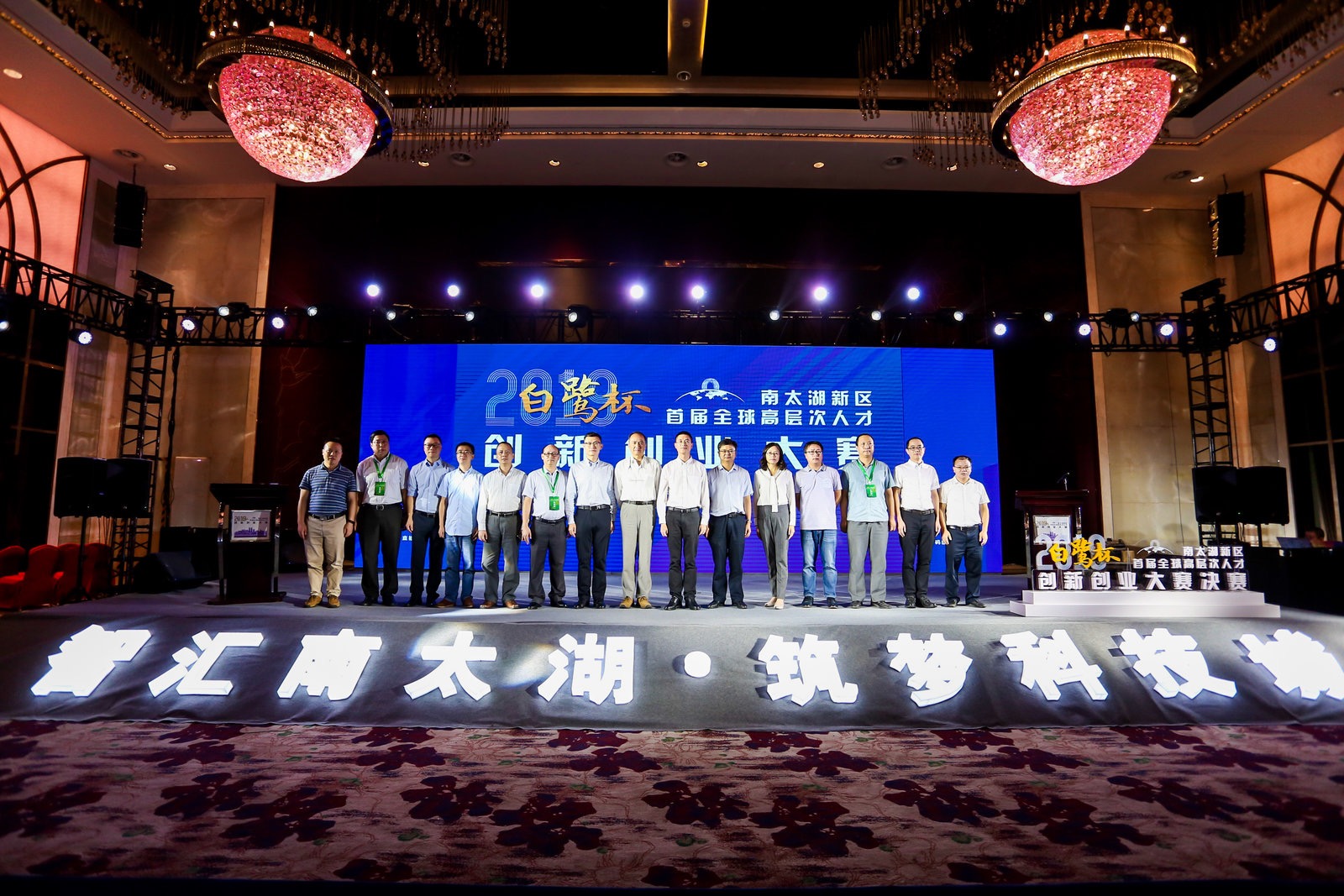 相關(guān)領(lǐng)導為獲獎團隊頒獎,決賽一、二、三等獎項目領(lǐng)軍人與南太湖新區管委會(huì )合影留念。